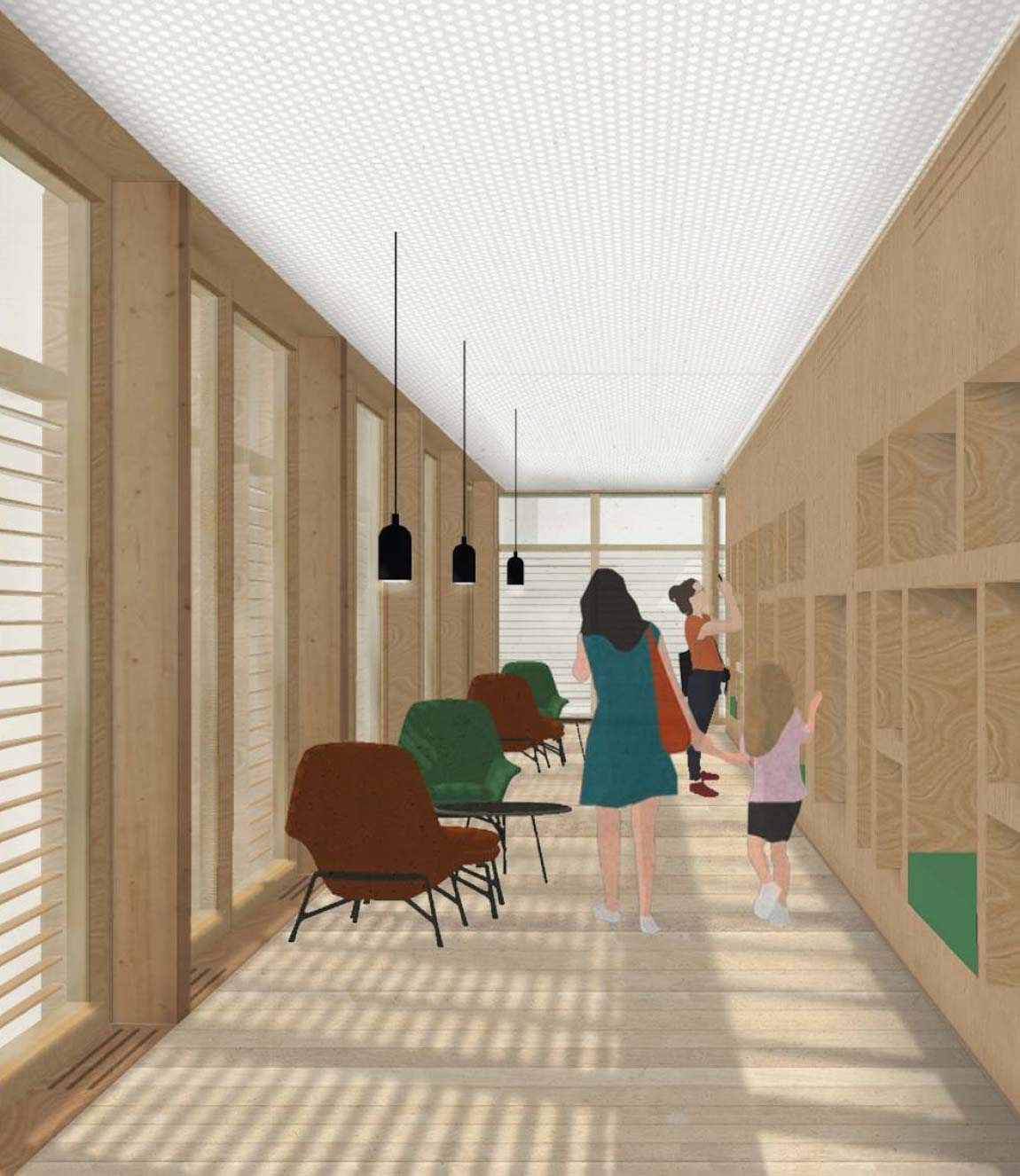 Op de eerste laag verbindt het ‘Vakpark’ de fabriek met het Dakpark. Het Vakpark bestaat uit een gemeenschapscentrum en een park waarin kleine kavels ruimte bieden aan uiteenlopende activiteiten zoals tuinieren, werken, afspreken, spelen of gewoon verblijven (afb.5). Het gemeenschapscentrum is bedoeld voor het organiseren van educatieve en informatieve activiteiten die te maken hebben met duurzaamheid en circulariteit. Op de derde bouwlaag bevindt zich ruimte voor de zelfbouw van woningen, er staat ook een modelwoning waarin de PCM modules zijn verwerkt. De woningen kunnen worden verhuurd, wat extra inkomsten voor de coöperatie oplevert, maar een concept als ‘innovator in residence’ is ook denkbaar.